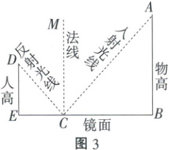 3. 测量物体高度的方法和原理(三):如图3,利用镜面反射.由物理知识易知∠DCM= ∠ACM,从而∠DCE