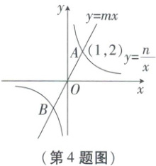 4. 如图,正比例函数$y = mx与反比例函数y= \frac{n}{x}$($m$,$n$是非零常数)的图象相交于$A$,$B$两点.若点$A的坐标为(1,2)$,则点$B$的坐标是