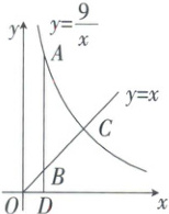 4. (2025·贵州)如图,一次函数 $ y = x(x\geq0) $ 与反比例函数 $ y= \frac{9}{x}(x>0) $ 的图象交于点 $ C $,过反比例函数图象上点 $ A $ 作 $ x $ 轴的垂线,垂足为 $ D $,交 $ y = x $ 的图象于点 $ B $,点 $ A $ 的横坐标为 $ 1 $. 有以下结论: