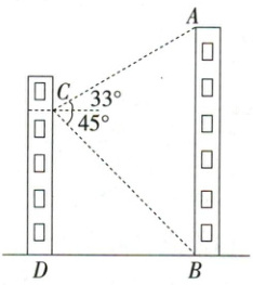 10. 如图,小敏在数学实践活动中,利用所学知识对他所在小区居民楼 $AB$ 的高度进行测量. 从小敏家阳台 $C$ 测得点 $A$ 的仰角为 $33^{\circ}$,测得点 $B$ 的俯角为 $45^{\circ}$,已知观测点离地面的高度 $CD = 36\ m$,求居民楼 $AB$ 的高度(结果保留整数).