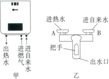 14. 图甲是小强的新家安装的燃气热水器,图乙是连接在热水器上的一个水龙头。小强想测量该燃气热水器的加热效率,他把热水器的加热温度设定为 48℃,调整把手使水龙头出水口流出水的温度为 40℃,1min 的时间测得从 B 管流进水龙头的自来水质量为 2kg。小强检查燃气表,发现热水器工作 1min 消耗燃气$ 0.02m^3($已知自来水的温度为 20℃,燃气的热值是$ 4×10^7J/m^3)。$问: