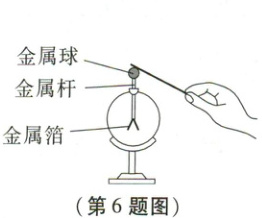 6. 实验室里常用验电器来检验物体是否带电。如图所示,用毛皮摩擦过的橡胶棒接触验电器的金属球,发现验电器两片金属箔会因排斥而张开,此时金属箔带