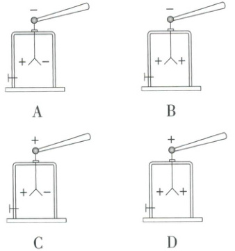 10. 用丝绸摩擦过的玻璃棒接触验电器,能正确表示玻璃棒和验电器金属箔片带电情况的是(