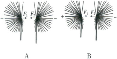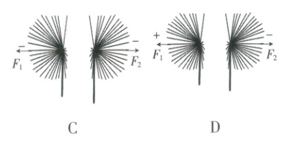 13. 将纸巾与塑料丝摩擦,然后将塑料丝迅速挂在两根绝缘棒上(如图)。实验中静止的塑料丝受力和带电情况可能正确的是(