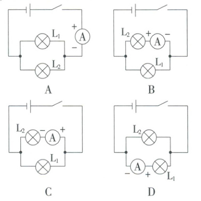 8. 下列电路图中,电流表能够直接测量通过灯$L_2$的电流的是(