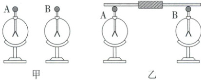 形成的。如图甲所示,验电器A带负电,B不带电。用带有绝缘柄的金属棒把验电器A、B的两金属球连接起来的瞬间(如图乙所示),金属棒中的电流方向是由B向A