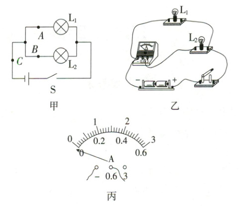 (1) 实验中需要测量 $ A $、$ B $、$ C $ 三处的电流,图乙是他某次测量时连接的实验电路,此时电流表测量的是