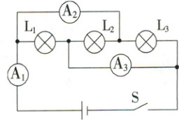 10. 如图所示,开关 $ S $ 闭合后,电流表 $ A_1 $、$ A_2 $、$ A_3 $ 的示数分别为 $ 1.2\,A $、$ 1\,A $、$ 0.6\,A $,则通过 $ L_1 $ 的电流是