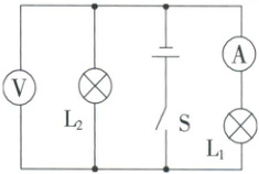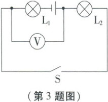 3. 如图所示,电源电压恒为 3 V,开关 S 闭合后,电压表示数为 2 V,则灯$ L_1 $两端的电压为