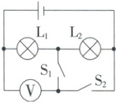 4. 如图所示,电源电压保持不变,当开关$ S_1 $闭合、$S_2 $断开时,电压表的读数是 3 V;当开关$ S_1 $断开、$S_2 $闭合时,电压表的读数是 4.5 V,则此时$ L_1、$$L_2 $两端的电压分别是
