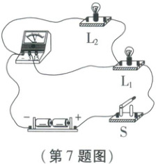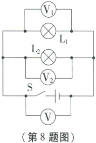 8. 如图所示,闭合开关,灯泡$ L_1 $比$ L_2 $亮,电压表 V 的示数为 3.8 V,下列说法正确的是(