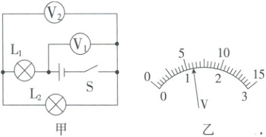 6. 小明按如图甲所示的电路进行实验,闭合开关,灯泡正常工作,电压表$ V_1 $和$ V_2 $的指针位置完全一样,如图乙所示,则$ L_1、$$L_2 $两端的电压分别为(