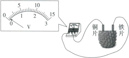 6. 将铜片和铁片插入菠萝中,制成一个水果电池。用电压表测量这个自制电池的电压,其示数如图所示。下列说法正确的是(