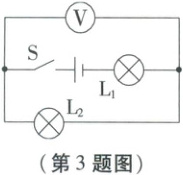 3. 如图所示,开关 S 闭合时,两灯均能发光,但一段时间后,两灯都熄灭了,电压表有示数且示数较大,该电路的故障可能是