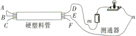 7. 如图所示,在一根横跨长江两岸的硬塑料管内穿有三根完全相同的电线,为了辨别哪两个线头为同一根电线的两端,可以用图示的测通器来测试。连接 A 和 B,将测通器的 m 连接在 D 上,当 n 连接 E 时小灯泡不发光,当 n 连接 F 时小灯泡仍不发光。由此可以确定为同一导线的两端是(