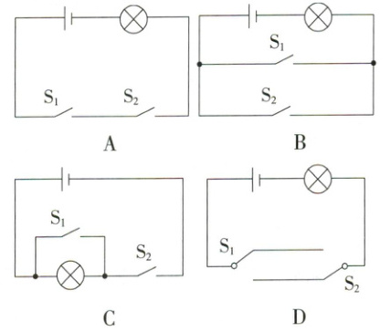 8. 小伊家装修房子设计楼梯照明电路时,希望在楼上、楼下安装两个开关,方便随时独立操控自家门口同一走廊灯泡的亮灭。下面的电路图设计正确的是(