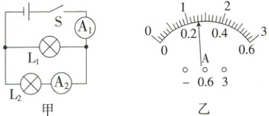 9. 如图甲所示,闭合开关 S,两只电流表的指针均指在如图乙所示的位置,则通过小灯泡$ L_1$的电流是