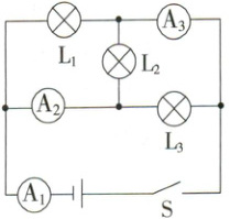 10. 如图所示,当开关 S 闭合时,电流表$ A_1$的示数为 1.5 A,电流表$ A_2$的示数为 0.7 A,电流表$ A_3$的示数为 1.2 A。通过$ L_1$的电流是