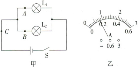 (3) 改变灯泡规格,重新进行上述实验,测得 A 处电流 Iₐ = 0.30 A,观察到 C 处电流表指针位置如图乙所示,则 B 处电流大小为_________。