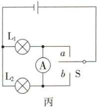 (4) 为更方便地测出两支路的电流,小明找来一个单刀双掷开关,设计了如图丙所示的电路,当开关 S 接 a 时,电流表测量通过_________(填$“L_1”$或$“L_2”)$的电流;当开关 S 接 b 时,请判断电流表能否正常测量通过另一条支路的电流,并说明理由(假设 S 接 a 时能够正常测量):_________。