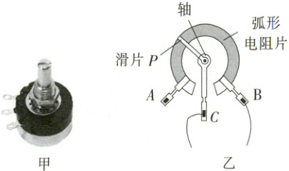 4. 图甲所示的是旋转式变阻器,它通过改变接入电路的弧形电阻片的长度来改变其连入电路的电阻大小。将该旋转式变阻器接入收音机中当作音量开关,如图乙所示,当滑片P沿顺时针方向旋转时,收音机的音量将