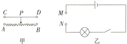 接入电路,也能达到同样的效果。图乙中,M、N间接入图甲中的滑动变阻器,当M与A、N与B相连接时,闭合开关,将滑片P向B端移动,此时滑动变阻器接入电路的电阻将不变