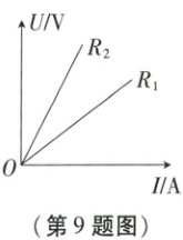 9. 在“探究电流与电压的关系”实验中,分别用$R_1$、$R_2$两个电阻进行探究,并根据各自的实验数据绘制出如图所示的$U-I$关系图像。从图中可以看出$R_1与R_2$的大小关系是(
