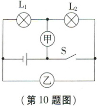 10. 如图所示,电源电压保持不变,开关S闭合后,灯$L_1$、$L_2$都能正常工作,甲、乙两个电表的示数之比是1:3,此时灯$L_1$、$L_2$的电阻之比是(