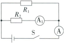 12. 如图所示,电阻$R_1$的阻值为12Ω,开关S闭合后,电流表$A_1$的示数为0.5A,电流表A的示数为0.8A。求:
