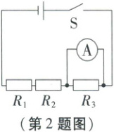 2. 如图所示,电源电压不变$,R_2= 6Ω,R_3= 4Ω。$当$R_1$两端电压为4V时,通过它的电流正好是2A,则$R_1$的电阻是