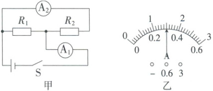 5. 如图甲所示,闭合开关S后,两个电流表指针偏转均如图乙所示,则$R_1$与$R_2$的阻值之比为(