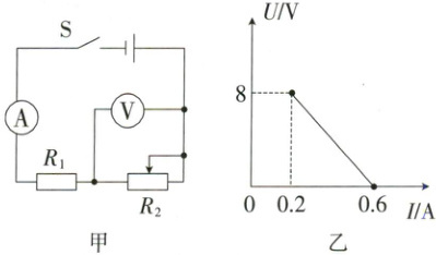8. 如图甲所示,闭合开关S,当滑动变阻器的滑片从最右端移至最左端时,电流表与电压表示数的关系图像如图乙所示,则滑动变阻器$R_2$的最大阻值为
