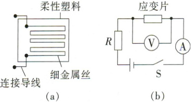 9. 图(a)为检测物体形变的应变片,在柔性塑料中置入一根细金属丝,将应变片与被检测物体粘贴固定,当被检测物体被拉伸时,应变片里的细金属丝会被拉长变细,导致其阻值变大。将应变片接入图(b)所示的电路,电源电压不变,当被检测物体被压缩时,应变片里细金属丝的阻值将