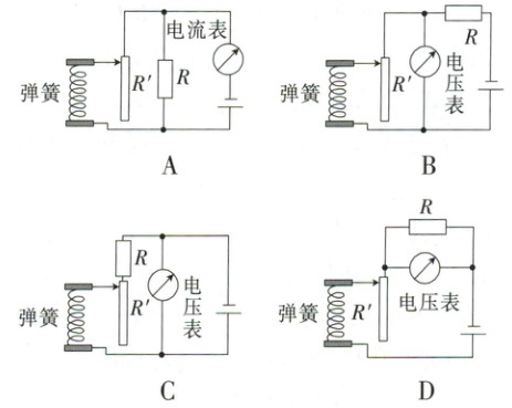 11. 小红同学在物理实践活动中,设计了如图所示的四种用电流表或电压表示数反映弹簧所受压力大小的电路,其中R'是滑动变阻器,R是定值电阻,电源两极间的电压恒定。四个电路中有一个电路能实现当压力减小时,电表示数减小,这个电路是(