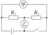 10. 如图所示,电源电压保持不变,当开关S断开,甲、乙两表均为电流表时,两表的示数之比I_甲:I_乙= 2:5;当开关S闭合,甲、乙两表均为电压表时,两表的示数之比U_甲:U_乙为(