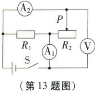 13. 如图所示,电源电压保持不变。闭合开关S,在滑动变阻器的滑片P向右移动的过程中,下列说法正确的是(