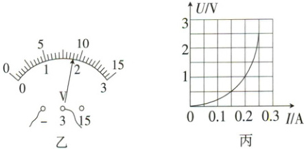 )端移动,直至电压表的示数为$2.5V$。(3)通过移动滑动变阻器的滑片$P$进行多次测量,记录数据并绘制$U-I$图像如图丙所示,由此可得小灯泡在$2.5V$电压下的电阻是