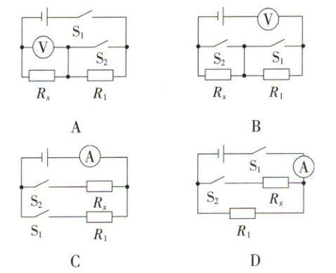 1.在用伏安法测未知电阻$R_{x}$的阻值时,电源电压未知且不变,如果缺少电流表或电压表,可以通过增加一个阻值已知的定值电阻$R_{1}$和开关来解决。下列四种方案中错误的是(