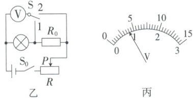 $V$;②保持滑片$P$的位置不变,将单刀双掷开关$S$接2,电压表示数如图丙所示,则小灯泡正常发光时的电阻$R_{L}= $