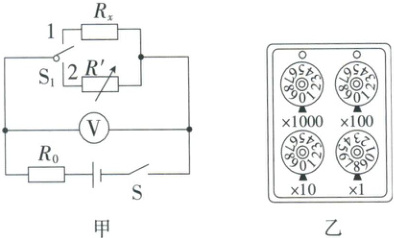 ),记录电压表的示数$U$;然后把开关$S_{1}$接到另一触点,并调节电阻箱$R'$,直到电压表示数也为$U$,读出此时电阻箱$R'$的示数(各旋钮的位置如图乙所示),则待测电阻$R_{x}$的阻值为 8