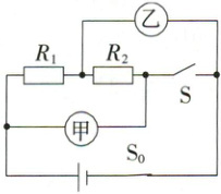 9. 如图所示,电源电压恒定,开关$S_{0}$闭合。当开关 S 闭合,甲、乙两表为电压表时,甲、乙两表示数之比为 7:3,电压表乙测