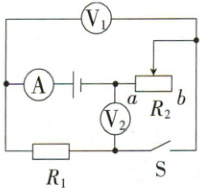 10. 在如图所示电路中,电源电压保持不变,闭合开关 S,滑动变阻器$R_{2}$的滑片从 a 端滑到 b 端的过程中,下列说法正确的是(