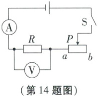 14. 如图所示,电阻 R 的阻值为 10 Ω,闭合开关 S,当滑动变阻器的滑片 P 移到 a 端时,电流表的示数为 0.6 A;当滑动变阻器的滑片 P 移到 b 端时,电流表的示数为 0.2 A。下列说法正确的是(