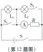 12. 如图所示,灯泡$L_{1}$标有“2.5 V 0.5 A”字样,$L_{2}$上只能看清“3 V”字样,设灯丝电阻不变,电源电压恒定。若 S、$S_{1}$、$S_{2}$均闭合,则$L_{2}$刚好正常发光,电流表读数为$I_{1}$;若只闭合 S,则$L_{1}$正常发光,电流表读数为$I_{2}$。电源电压为