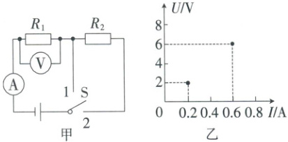 15. 如图甲所示,当开关 S 从接点 2 转换到接点 1 时,电流表、电压表对应示数如图乙所示。根据图中信息求: