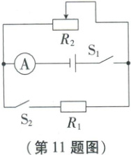 11. 如图所示,电源电压可调,定值电阻$R_{1}$标有“6 Ω 1.5 A”字样,滑动变阻器$R_{2}$标有“10 Ω 1 A”字样。先闭合$S_{1}$后,再闭合$S_{2}$,电流表的示数将