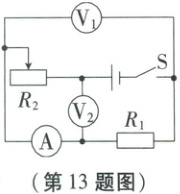 13. 如图所示,电源电压保持不变。闭合开关 S 后,将滑动变阻器$R_{2}$的滑片从任意一点向右滑到另外一点时,电流表 A、电压表$V_{1}的示数变化量分别为\Delta I$、$\Delta U_{1}$,则在滑动滑片的过程中,电压表$V_{2}$的示数