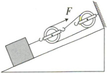 11. 有人将斜面和滑轮组合在一起来提升重600 N的木箱,如图所示,动滑轮重20 N,用160 N的拉力F使木箱沿着斜面向上滑动5 m,同时木箱也升高了3 m,此过程中由于绳与滑轮间有摩擦而需做的额外功为40 J。求: