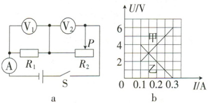 12. 如图a所示,电源电压保持不变,闭合开关S,调节滑动变阻器的滑片P,两个电压表的示数随电路中电流变化的图像如图b所示,根据图像信息可知,