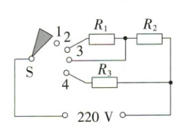 9. 小松家买了一个多挡位电火锅,其内部电路原理如图所示,部分参数如下表所示。$ R_1 $、$ R_2 $、$ R_3 $ 均为发热电阻,$ R_3 $ 的阻值为 44 Ω。旋转开关 $ S $,让其和触点 1 和 2、2 和 3 或 3 和 4 接触时,可实现不同挡位的转换。